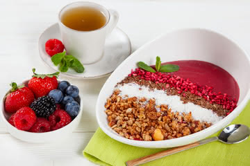 Малина, миндальное молоко, сироп топинамбура, клубничный джем, овсяные хлопья, ягоды асаи, кокосовая стружка*, семена льна*, фундук, семена подсолнечника, кокосовое масло.
