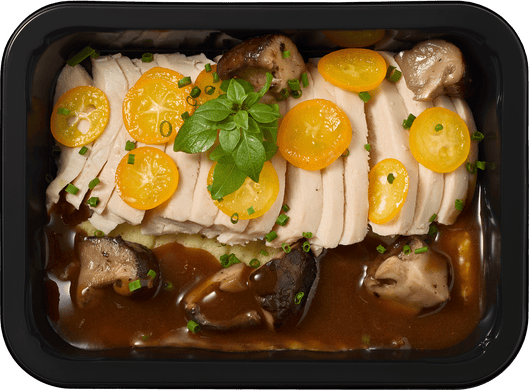 Филе курицы су-вид с нежным картофельным пюре с трюфелем. Подаётся с грибами шиитаке, слайсами кумквата и лёгким соусом на основе бульона.