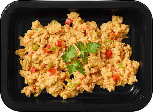 Скрэмбл - это яичница-болтунья, приготовленная при постоянном помешивании. Благодаря этой технологии яйца не зажариваются и не становятся слишком твердыми. Наш вариант скрэмбла, помимо яиц, содержит запечённую индейку, сладкий перец Рамиро и цуккини. Натуральные ингредиенты, минимум масла — максимум пользы и ярких вкусов в каждом кусочке.