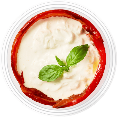 Запечённый перец рамиро с нежной кремовой страчателлой и оливковой пастой. Элегантная закуска в средиземноморском стиле.