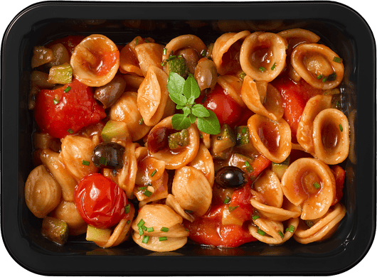 Орекьетте — паста в форме «ушек» родом из Южной Италии. Готовим с обжаренными черри, печёным перцем и оливками таджаски.