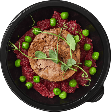 Говядина, чечевица, свекла, репчатый лук, зелёный горошек*, сливочное масло*, проростки зеленого гороха*, кофейный маринад, чеснок, соль*, чёрный перец, овощной бульон, растительное масло.
