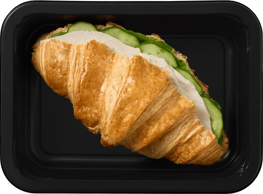Хрустящий круассан с филе фермерской куриной грудки, огурцами, салатом и легким творожным сыром. Сытно и легко.