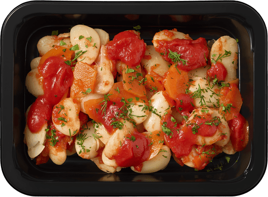Гигантская белая фасоль, запечённая под томатным соусом с морковью, шалотом и сельдереем. Сытное вегетарианское блюдо, с лёгкой томатной сладостью.